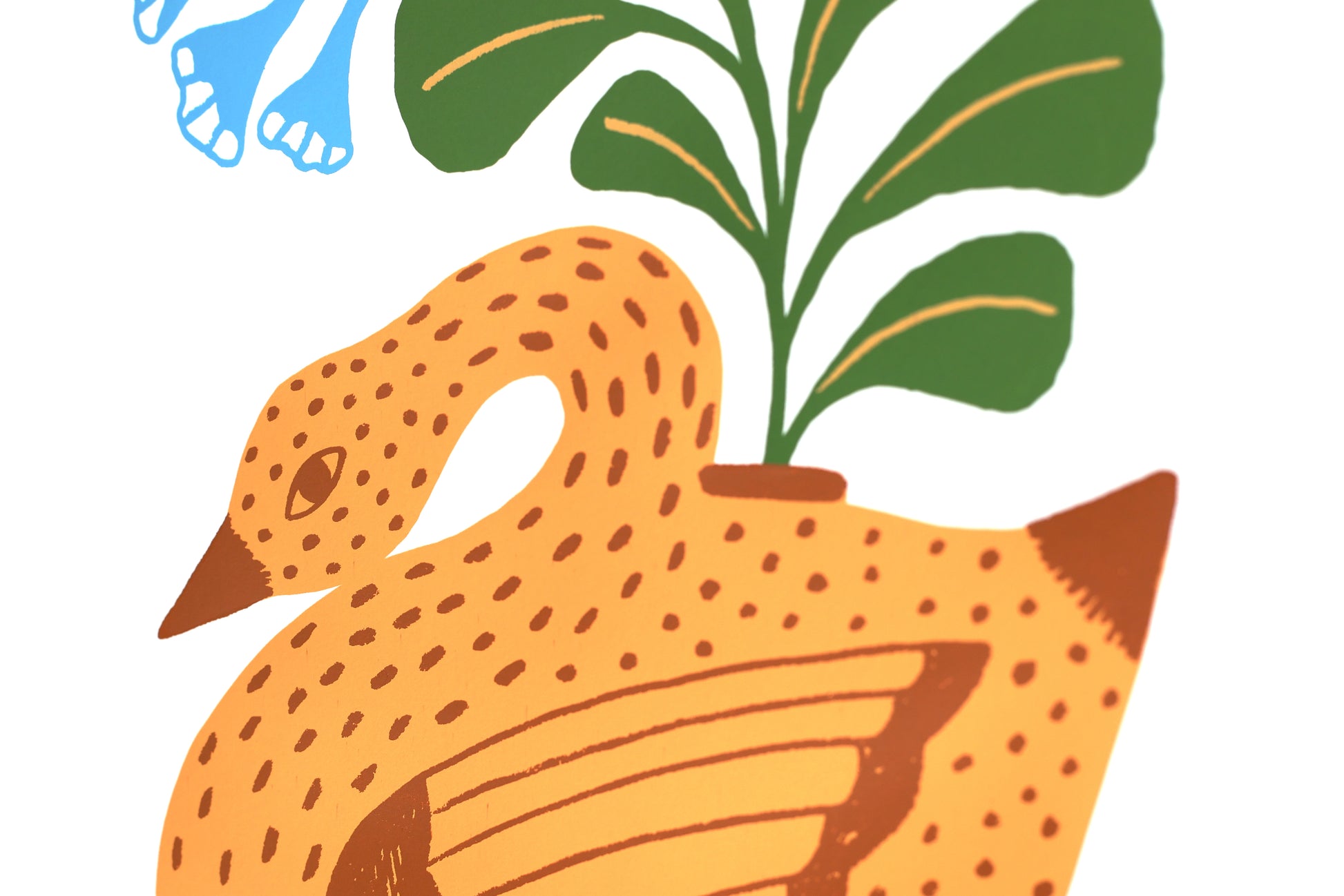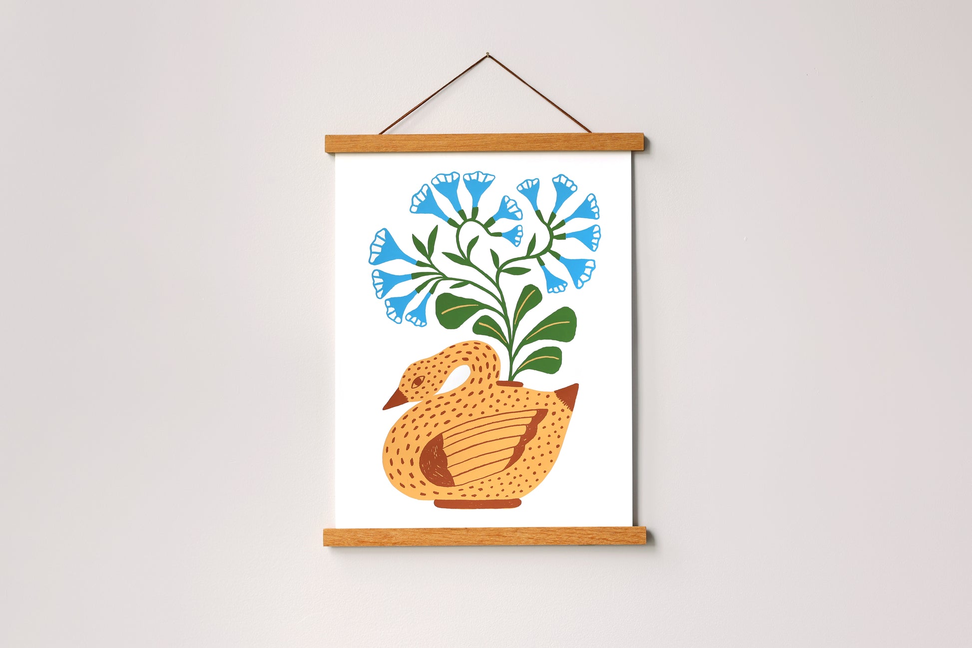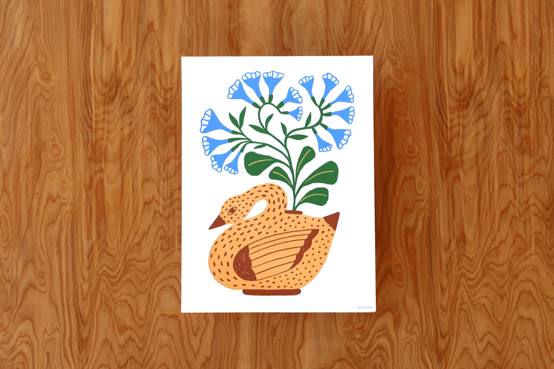 This silkscreen print features a terracotta vase in the shape of a goose holding fresh sprigs of bluebells. Pair it with the Nasturtium Hedgehog print for a special discount!