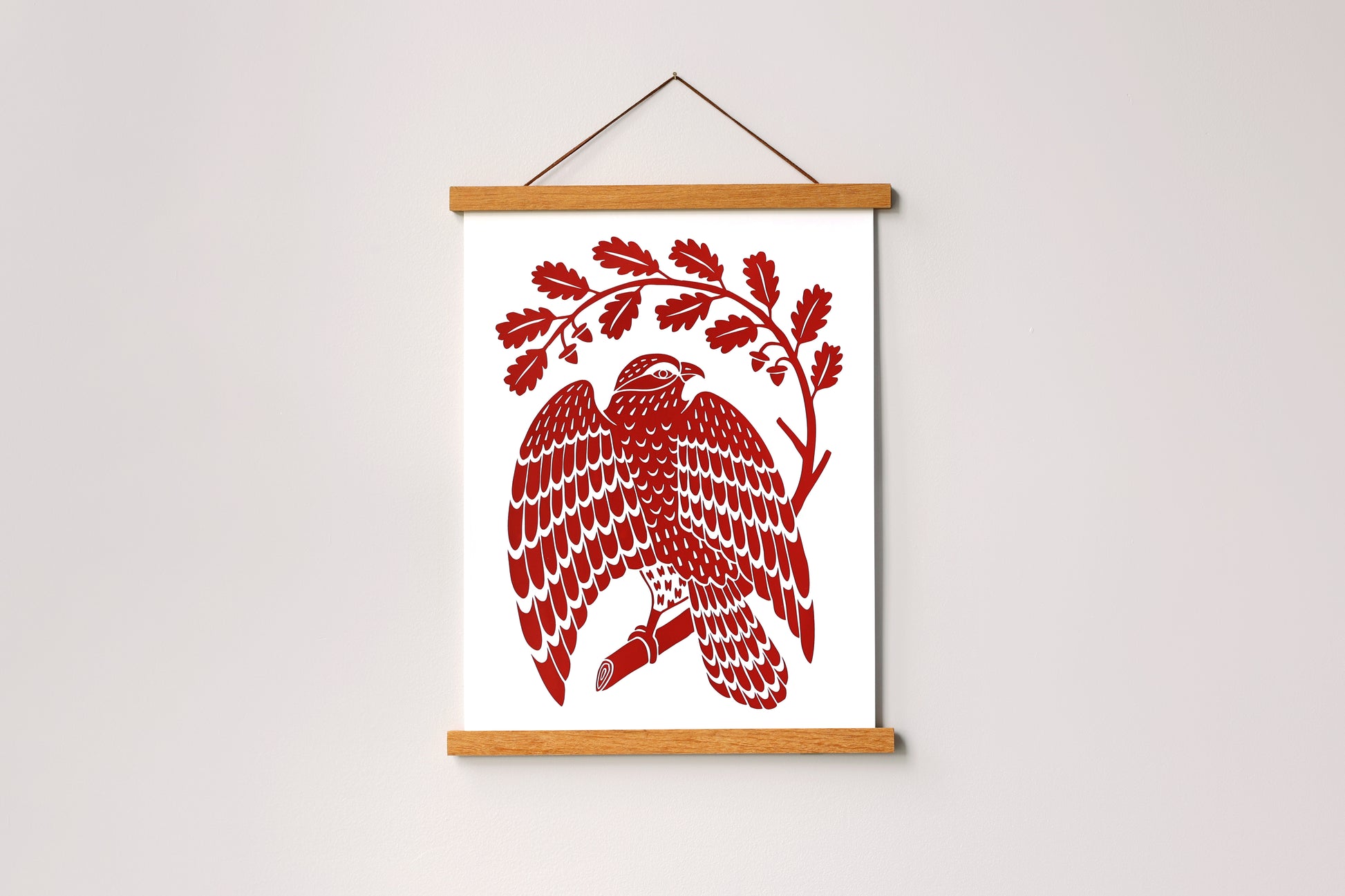 This silkscreen print features a hawk perched on the branch of a chestnut oak, both species native to Virginia. The ink color is a rich, brick red.