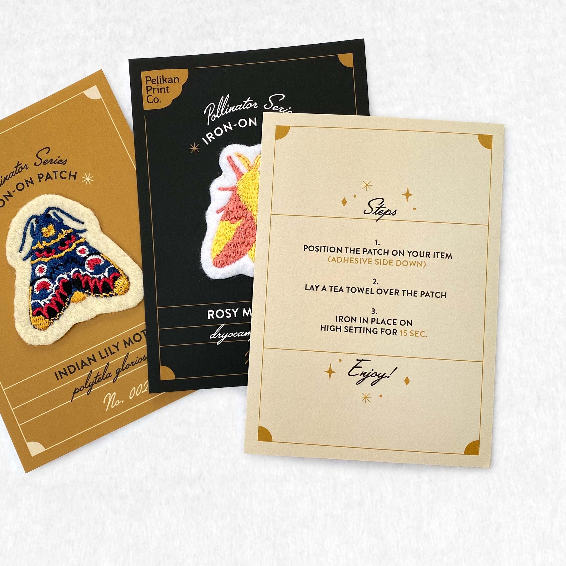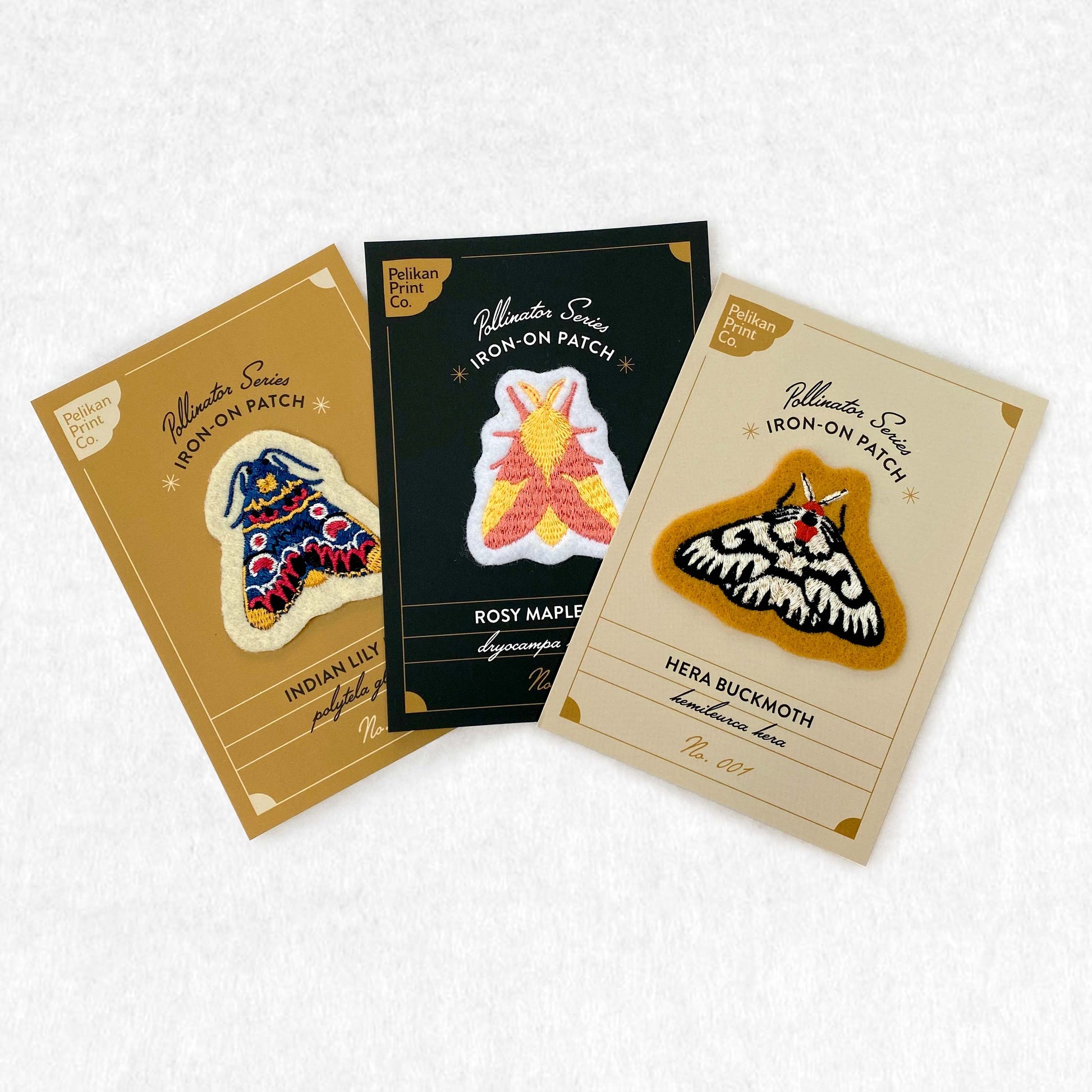 Rosy Maple Moth is part of the Pollinator Patch series, a set of embroidered moth patches that celebrate pollinators and remind you to always look for the light. They have an iron-on backing and a sturdy felt base. Perfect as a gift, an addition to a tote bag, or an embellishment for your favorite jacket. Designed and machine embroidered in-house.