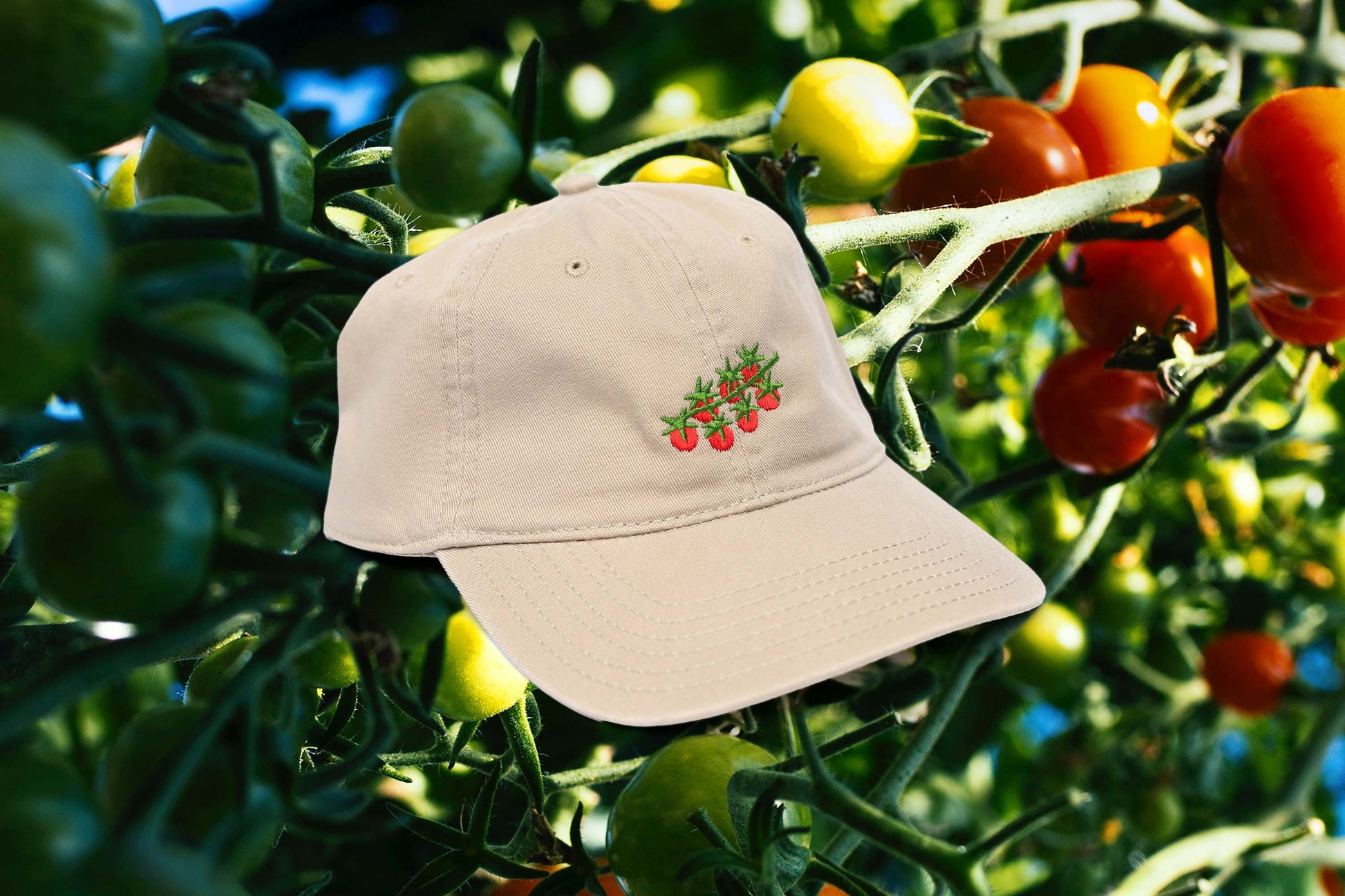 An ode to fresh cherry tomatoes sunwarmed on the vine. This perfect late summer snack never goes out of season. Plus, you'll get lots of compliments at the farmer's market. Pelikan Print Co.'s best selling design! Shown here in tan, but also available in mustard, green, vintage green, vintage blue, brown and black.